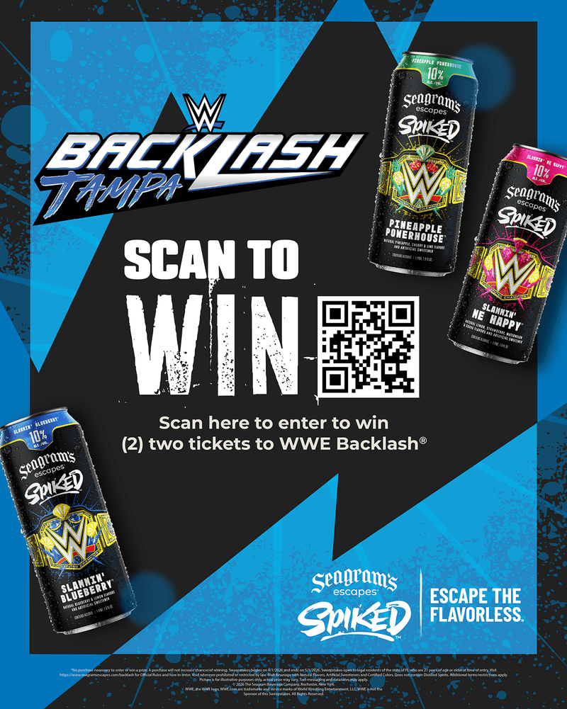 ELIGIBILITY: The Seagram's Escapes Spiked WWE Backlash Scan To Win Sweepstakes ("Sweepstakes") begins at 12:00:01 AM Eastern Time ("ET") on 4/1/2026 ("Start Date") and ends at 11:59:59 PM ET on 4/28/2026 ("End Date") ("Promotion Period"). Sweepstakes open to legal residents of Florida who are 21 years of age or older at time of entry. This Sweepstakes is sponsored by High Falls Operating Co, LLC d/b/a The Seagram Beverage Company ("Sponsor).The Sponsor and World Wrestling Entertainment, LLC along with their respective parents, subsidiaries, divisions, affiliates, suppliers, employees, distributors and advertising, promotional and judging agencies (collectively, "Released Parties"), any person affiliated with the alcoholic beverage industry, including but not limited to retailers of alcohol products, and their immediate family members (spouses, domestic partners, parents, children, and siblings) and household members of each (whether related or not) are not eligible to participate in or win the Promotion. By participating, entrants agree to these Official Rules and the decisions of the Sponsor. Individuals who have won a prize (or whose household has won a prize) from Sponsor within six (6) months prior to the start date of this Sweepstakes are not eligible to participate or win. "Household" members shall mean people who share the same residence at least three (3) months a year. By participating, entrants agree to these Official Rules and the decisions of the Sponsor. © 2026 The Seagram Beverage Company, Rochester, New York. All Rights Reserved. WWE, the WWE logo, WWE.com, are trademarks and service marks of World Wrestling Entertainment, LLC.